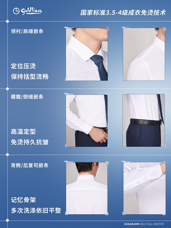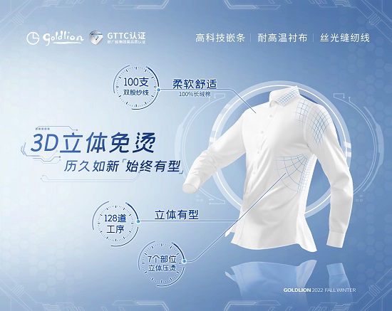 每一件金利来3D立体免烫衬衫必需经由128道工序,7个部位立体压烫,为你节约30分钟,告竣真正的免烫。